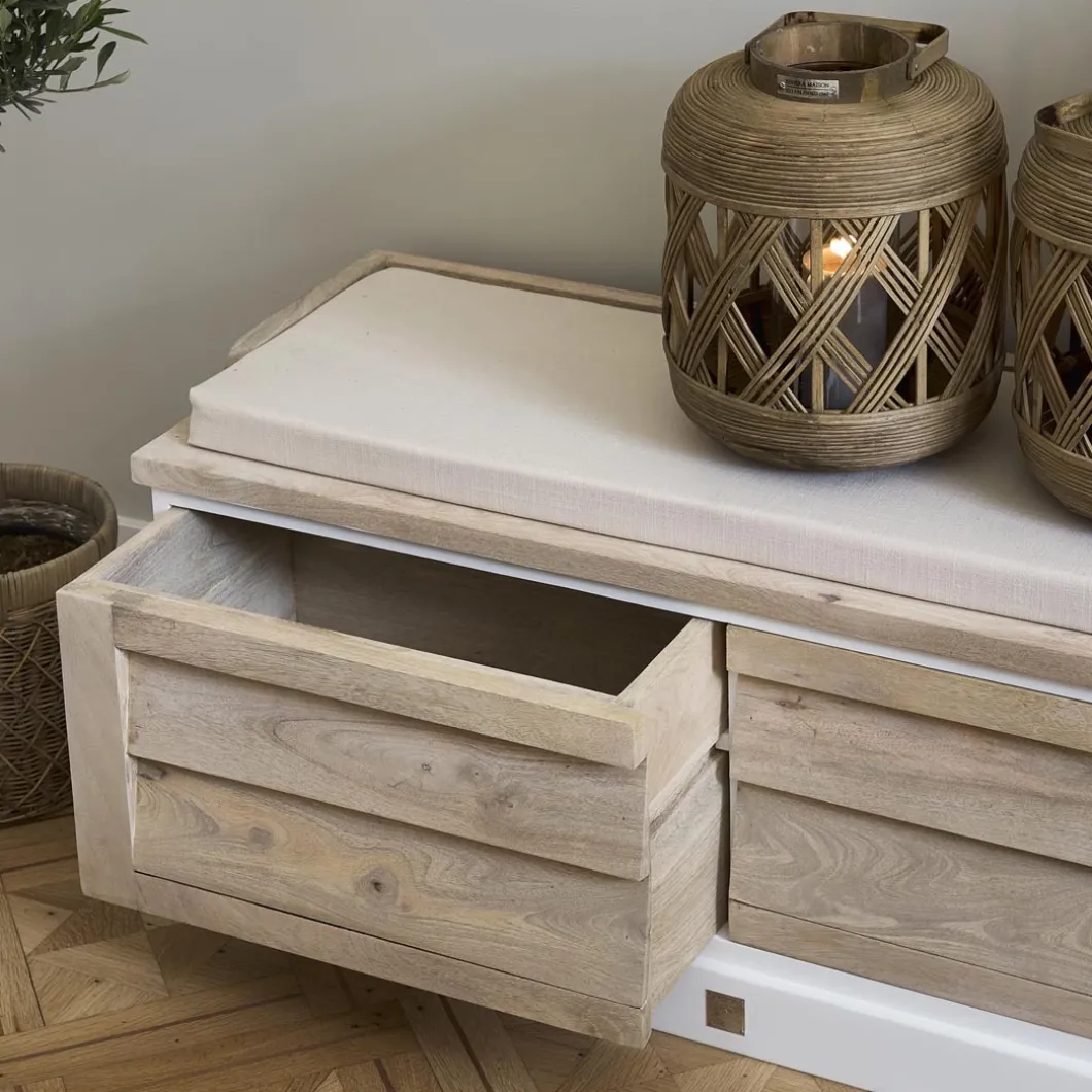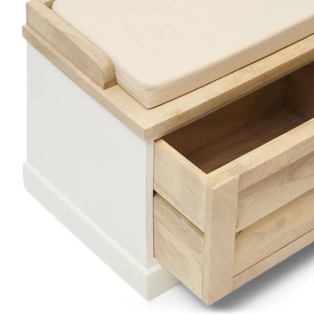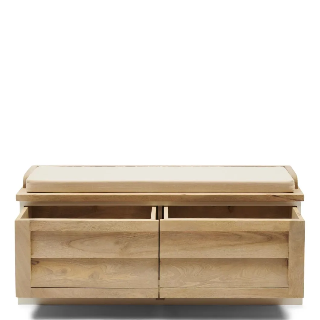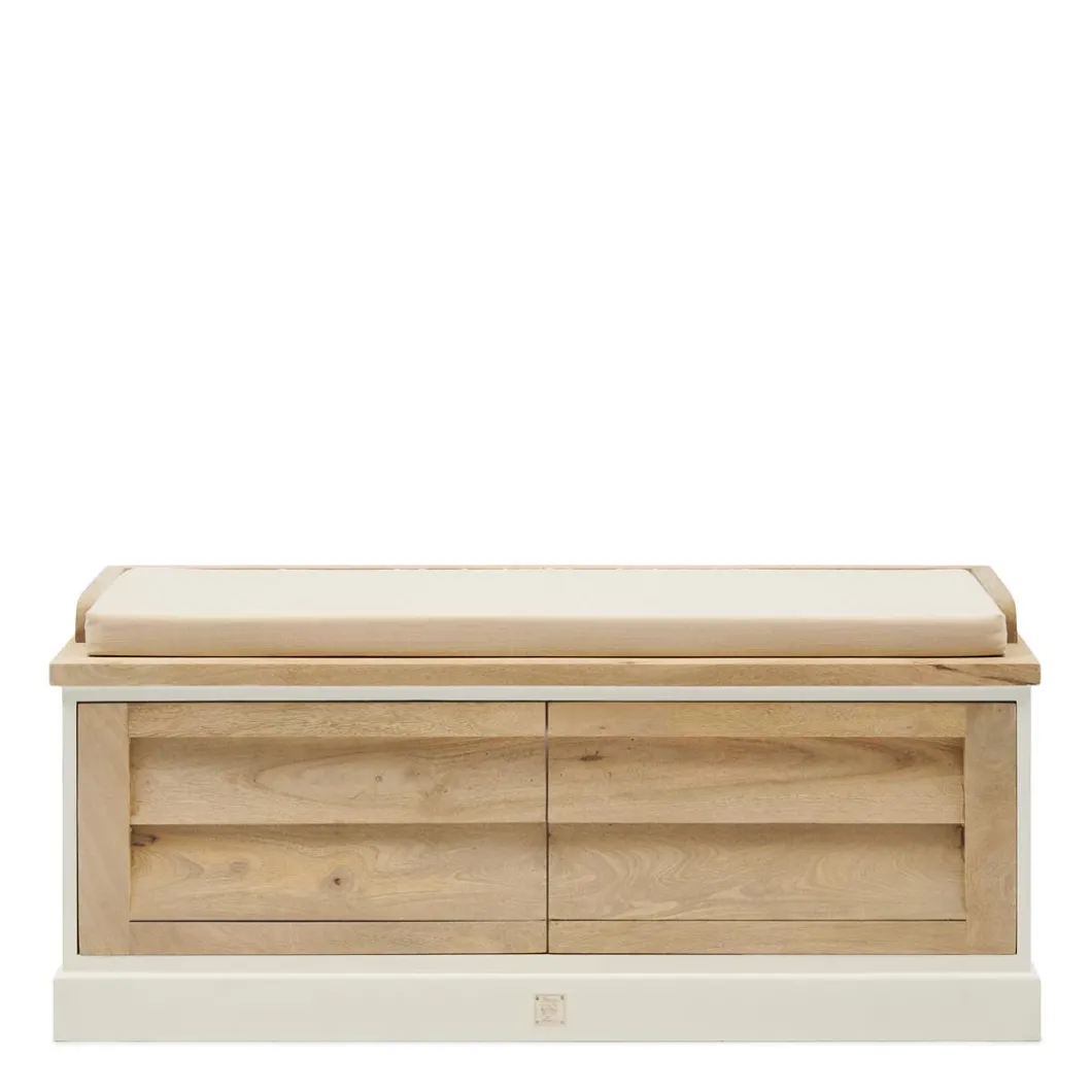 Een multifunctioneel bankje handgemaakt van duurzaam mangohout. De mangoboom wordt pas gekapt als hij helemaal geen vruchten meer produceert. Zo krijgt de boom een tweede leven in onder meer de meubelbranche. De bekleding van dit bankje is van katoen. Het bankje heeft opbergruimte.