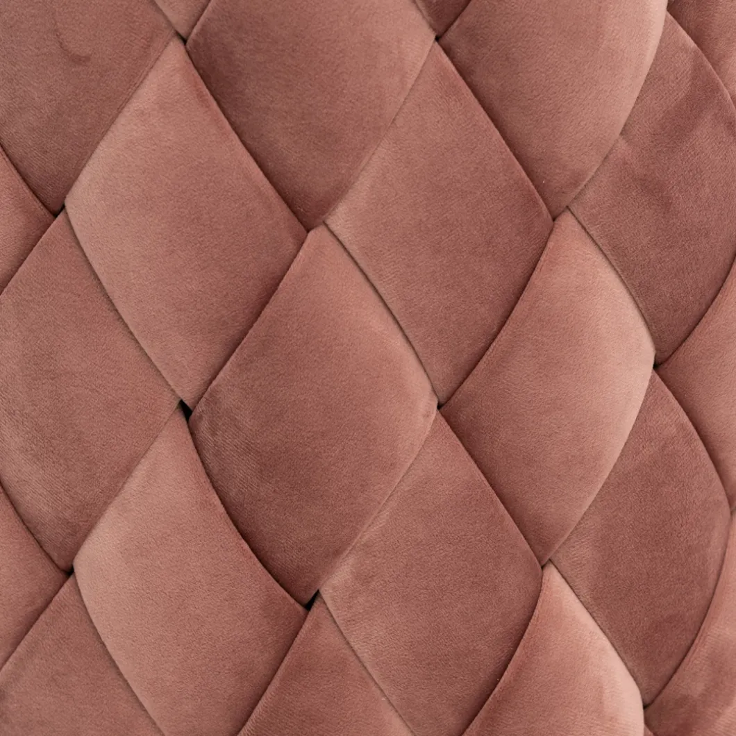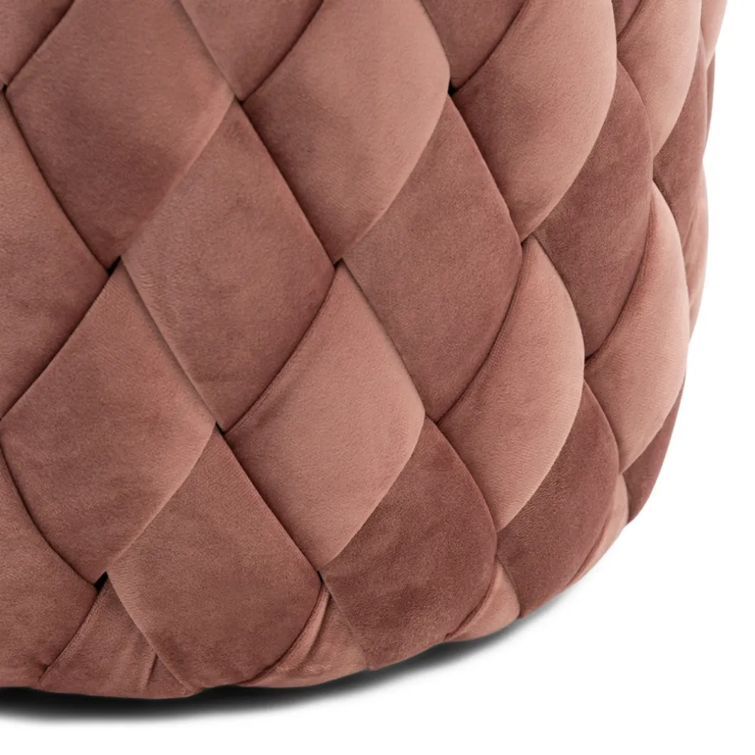 Hier kun je zien hoe goed eenvoud kan werken. De bekleding van deze ronde poef bestaat uit met de hand gevlochten repen stof. Het resultaat is prachtig. Dat komt mede door de stof die is gebruikt, Velvet III, in de kleur Rose Stain.