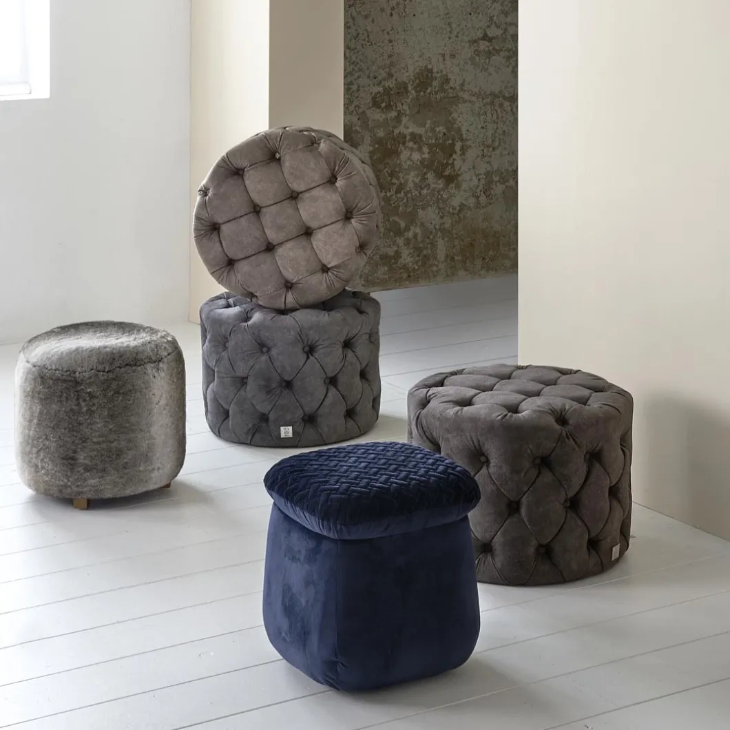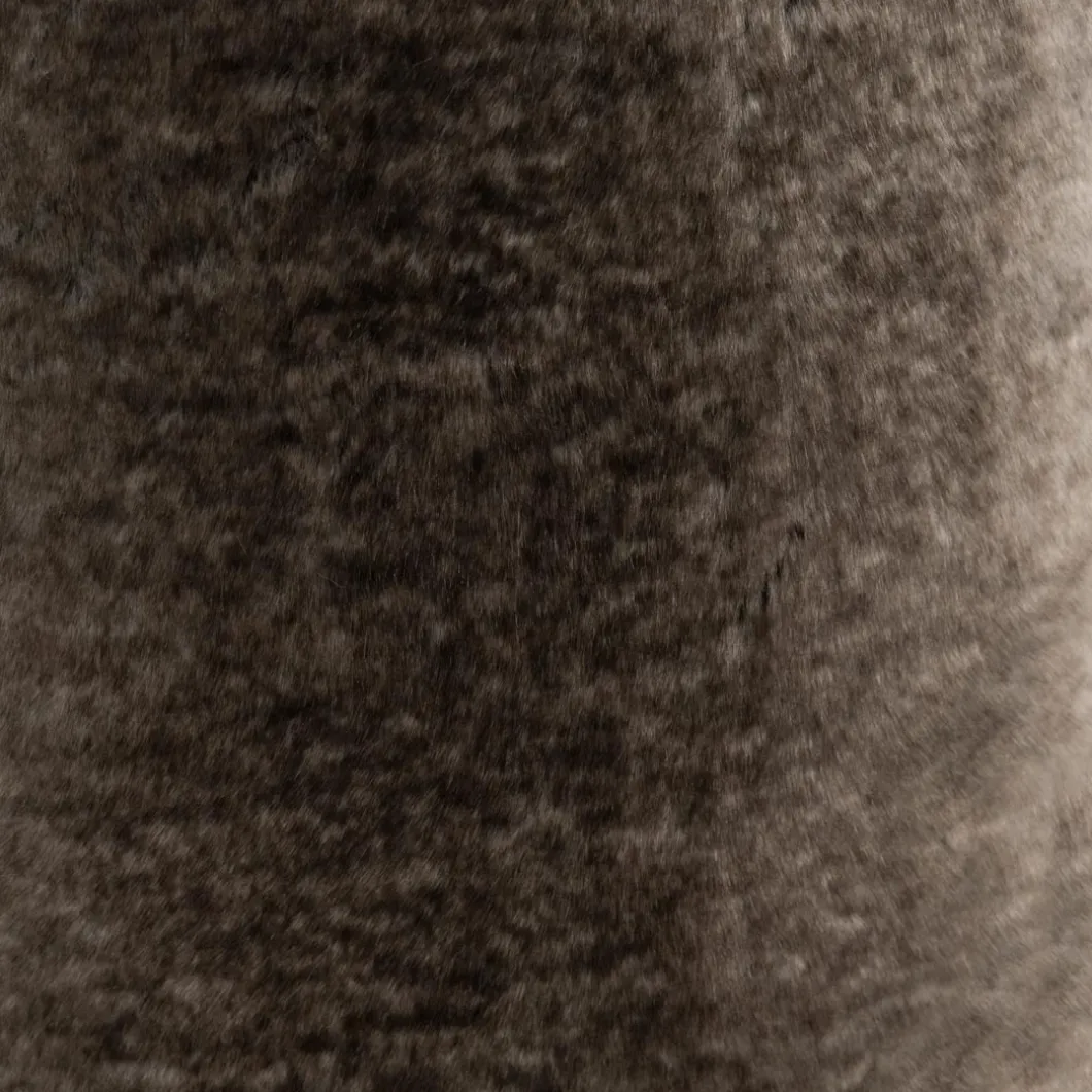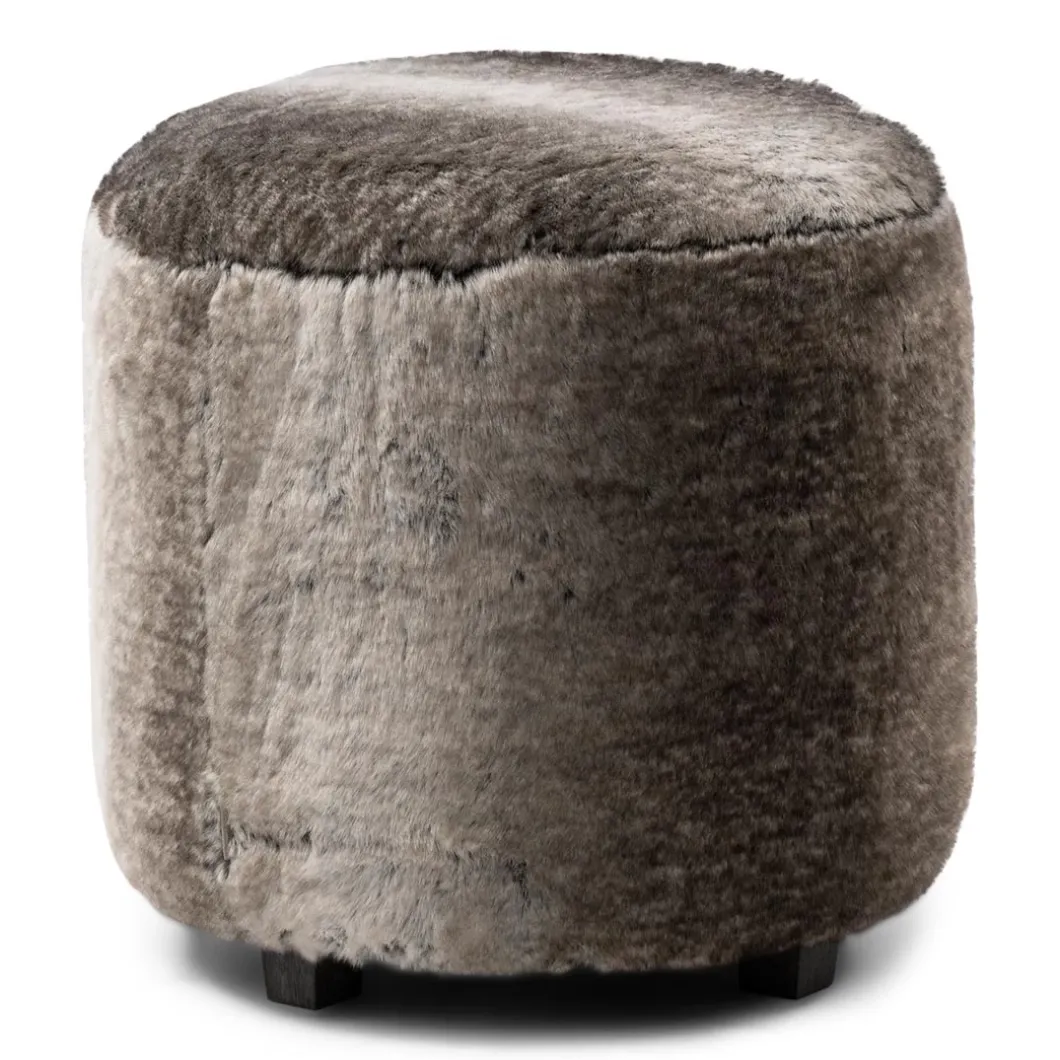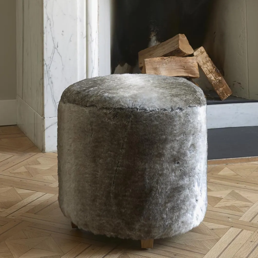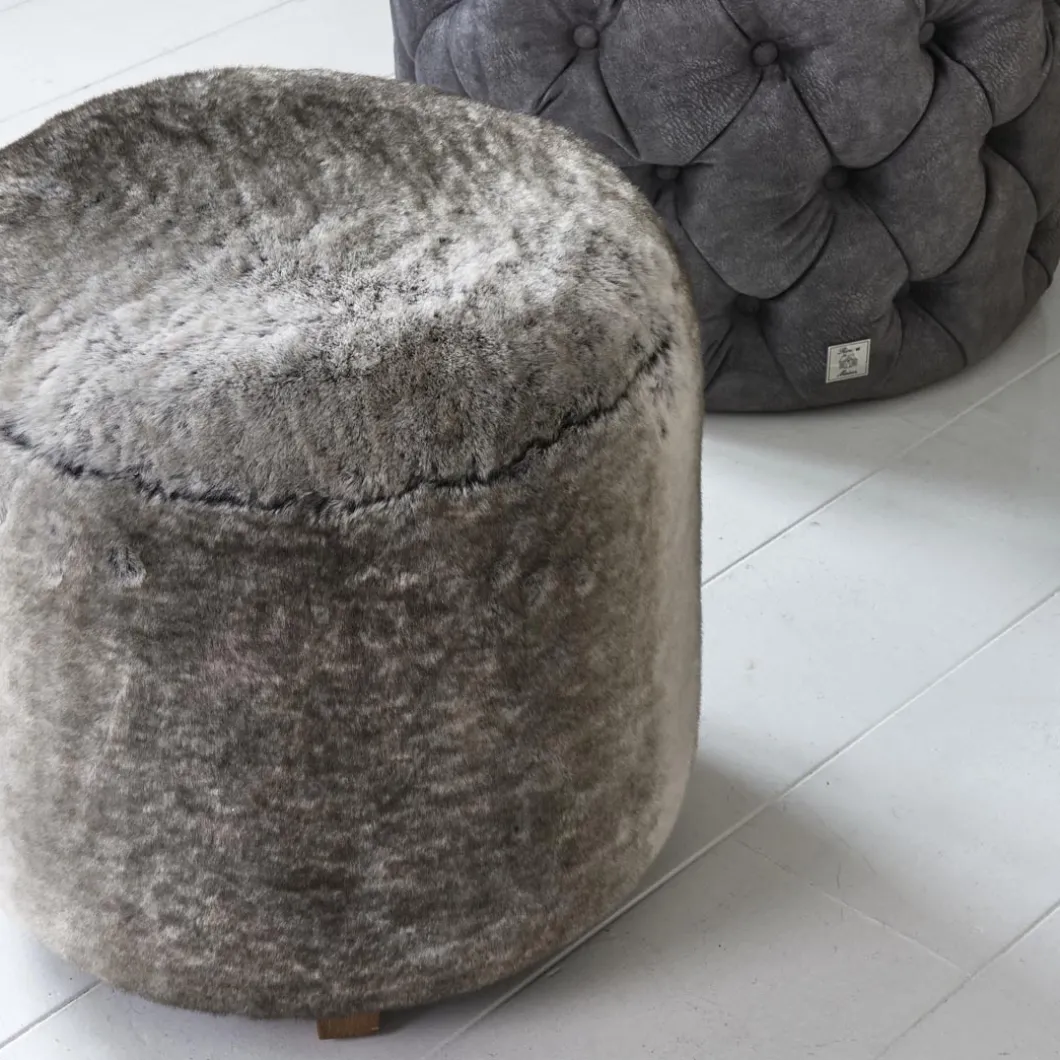 Een poef of voetenbankje van chinchilla bont. Nep dan, want de echte pels is natuurlijk erg dieronvriendelijk. Maar die zilver- of blauwgrijze vacht ziet er aanlokkelijk uit om de vermoeide voeten op neer te vlijen. Het frame en de poten zijn van rubberhout. Afmeting 43 x 46 cm. Ook met zwart bont verkrijgbaar.