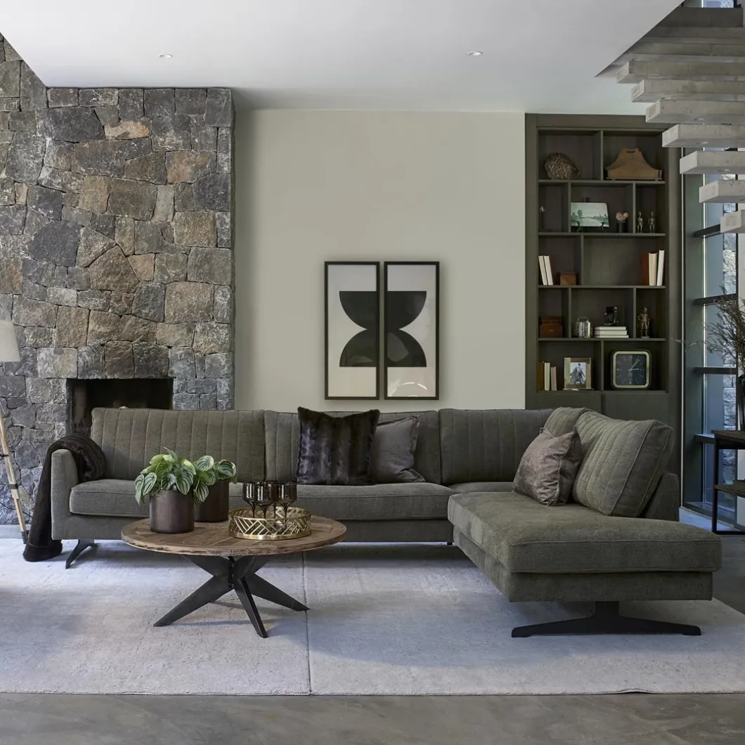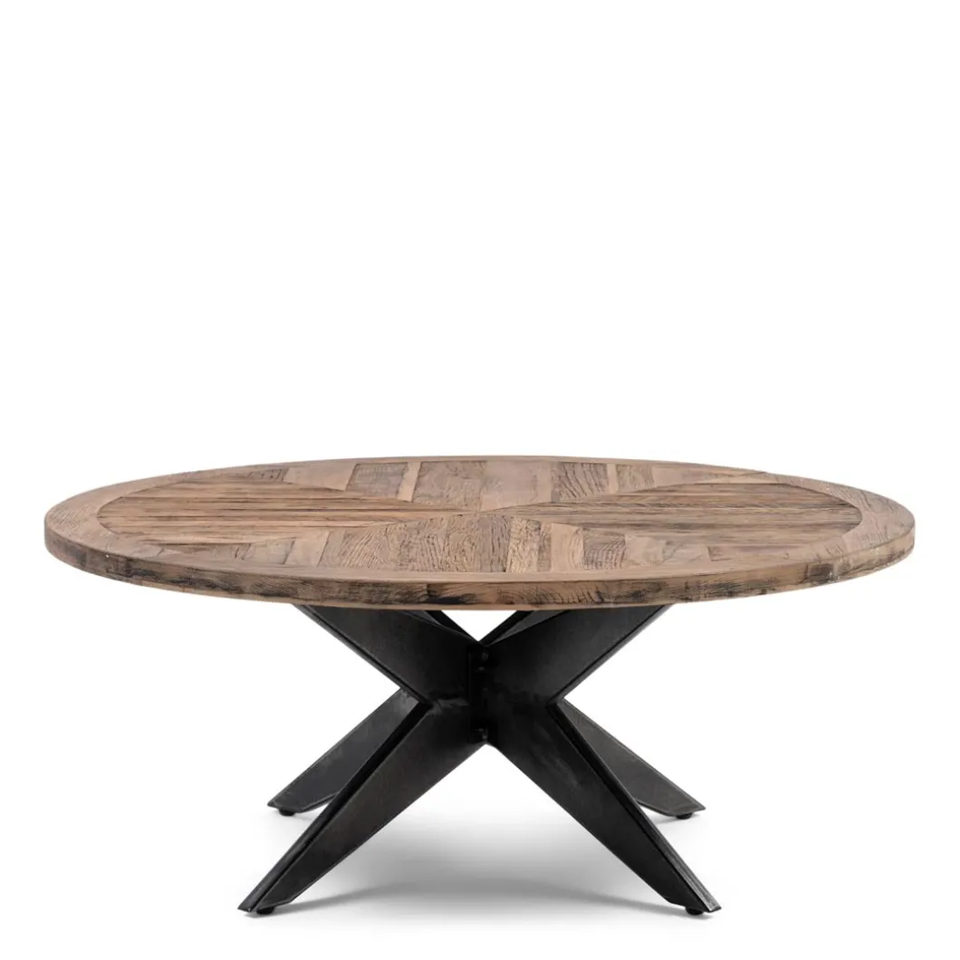 De Falcon Crest salontafel met een diameter van 100 cm is een ronde tafel met een blad van gerecycled eikenhout dan in de vorm van een kruis is ingelegd. Onder de industriële salontafel staat een frame van ijzer in eveneens een gekruiste vorm. De tafel is 40 cm hoog.