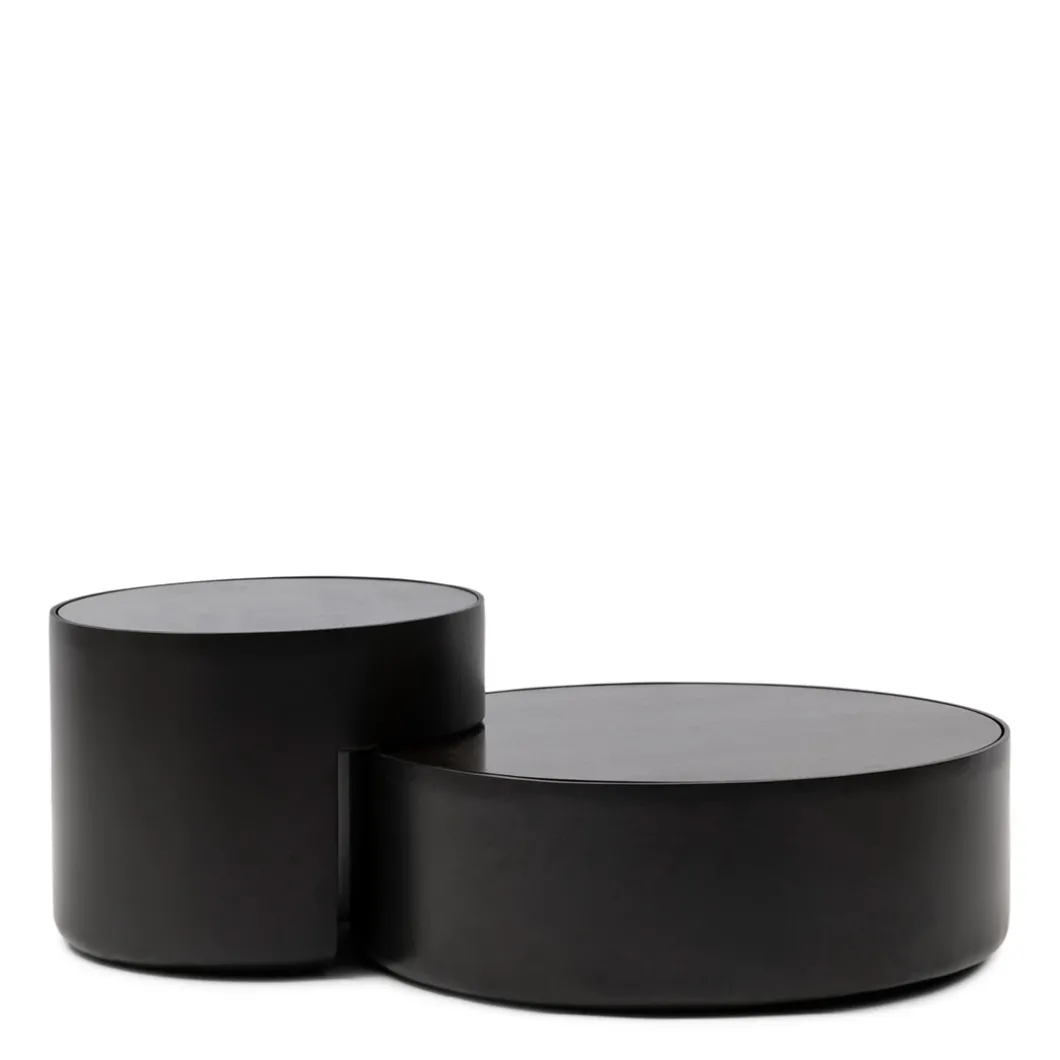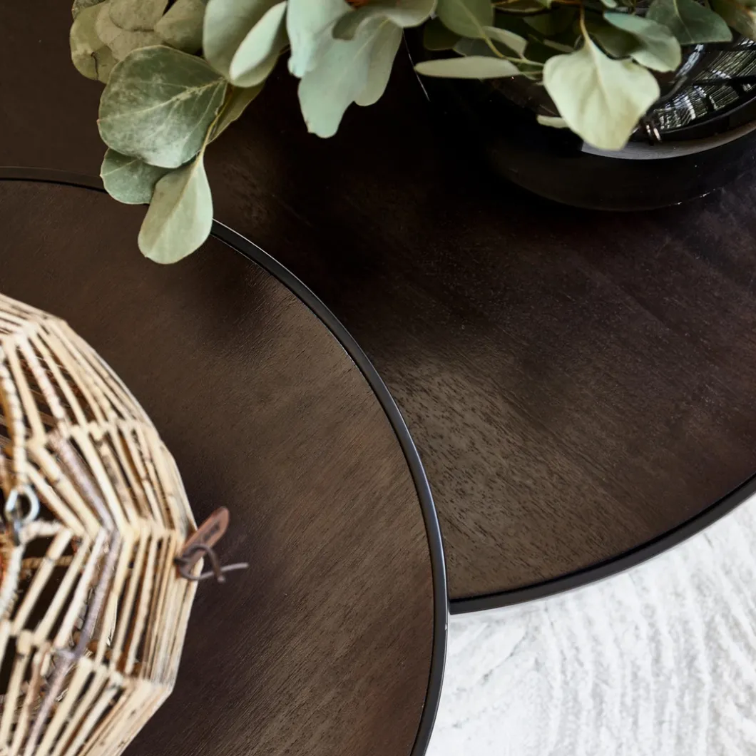 Met salontafel Hollywood Hills haal je niet één maar wel twee tafels in huis. Deze set bestaat namelijk uit twee ronde salontafels, waarbij de lagere tafel een uitsparing heeft. Hierin kun je de kleinere tafel schuiven. Maar dat hoeft natuurlijk niet, want ook los van elkaar staan deze tafeltjes met hun zwart metalen frame en blad van warmgrijs mangohout prachtig in je interieur.