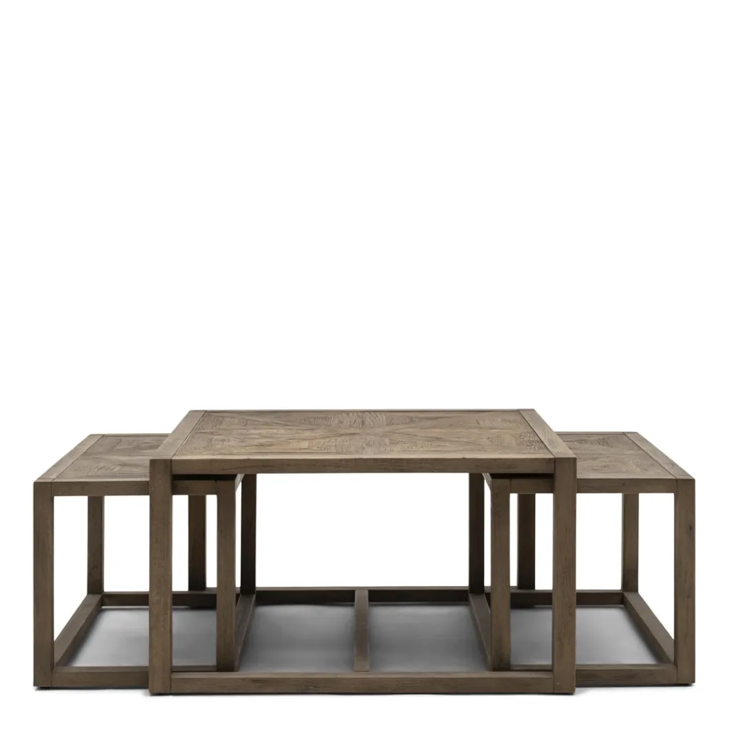 Deze salontafelset van 3 tafels is de nieuwe toevoeging in de Romora Bay lijn. De grootste tafel is vierkant met de afmeting 80x80cm. De kleinere tafels passen daar precies onder. De tafelset is zo gemaakt dat je het samen kan gebruiken maar ook los, zodat je zelf de gewenste opstelling kan maken. De tafelset is gemaakt uit recycled eikenhout en heeft met het visgraatmotief een chique uitstraling.