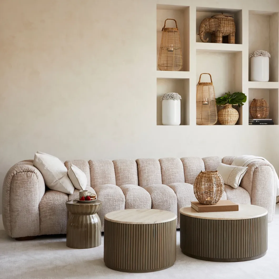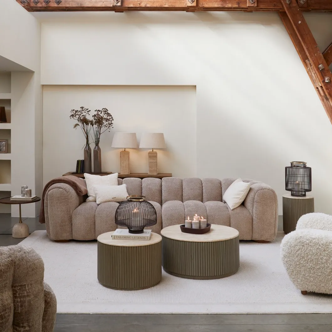 - Deze ronde salontafel is een stijlvolle toevoeging aan je woonkamer. Het travertijnen blad straalt een chique en tijdloze elegantie uit, waardoor het een eyecatcher is in elk interieur. De brede voet, ingelegd met mangohouten stroken, zorgt voor een moderne look en voegt zowel stabiliteit als karakter toe aan het ontwerp. Deze salontafel is perfect om een luxe accent toe te voegen aan je interieur en vormt een prachtig middelpunt in jouw woonkamer.