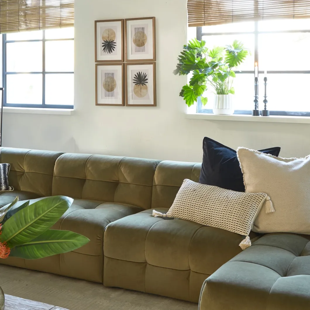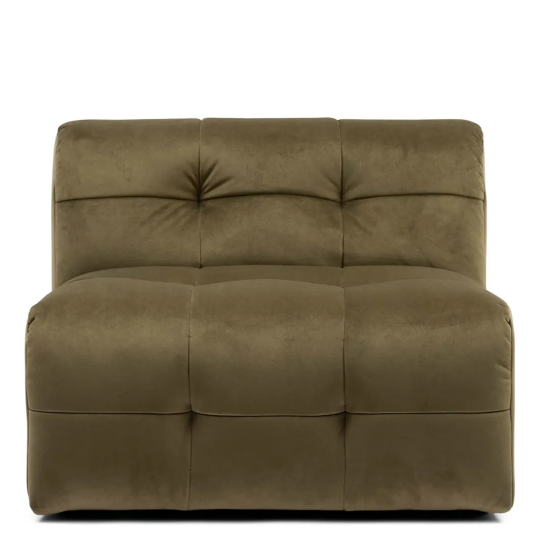 Dit is het middendeel van de zelf samen te stellen, modulaire bank The Jones. Een heerlijke, lage bank, met opvallende bekleding met capitonnering zonder knoop. Dit middendeel heeft alleen een rugleuning, dit maakt hem ook zeer geschikt om als los element, als een soort van loveseat, in de ruimte te plaatsen.
