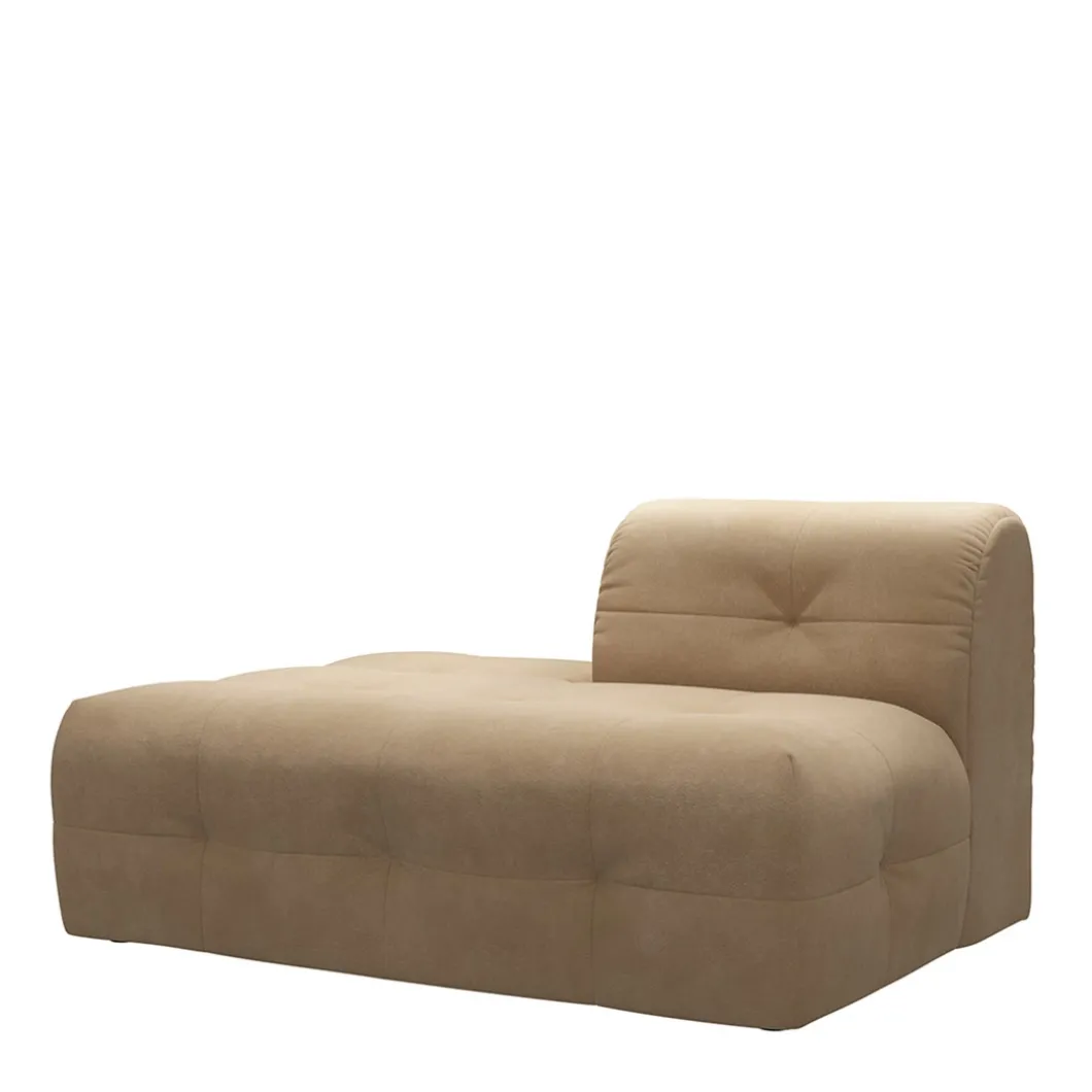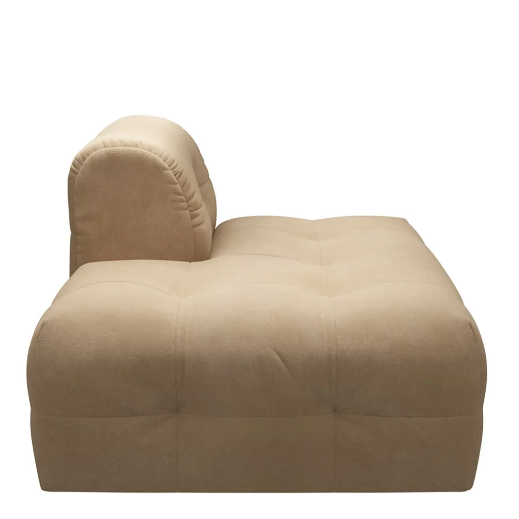 Van modulaire bank The Jones is dit de lounger links. Een lounger is een extra element voor je elementenbank, dat lijkt op een chaise longue, maar dan met maar één leuning. Deze lounger heeft een prachtige, retro-uitstraling door zijn lage zit en gecapitonneerde bekleding, maar dan zonder knoop.